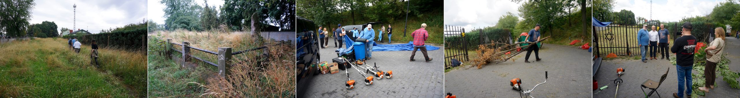 Scenes from the first part of the project: walking the cemetery grounds before starting, preparing the tools, dragging large branches for disposal, and a visit from the mayor of Grójec. Photos © RJH.