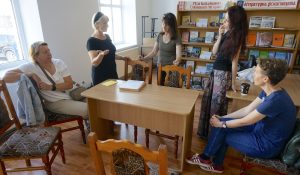 Marla with Sasha in the Jewish cultural library he is developing in the Coal Street Synagogue under renovation in Lviv. Photo © RJH.