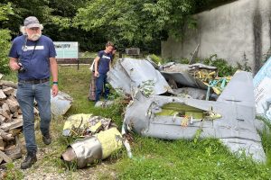 Debris from downed Russian drones stored temporarily in front of the north mass grave memorial in Rohatyn this summer. Photo © RJH.