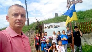 Andriy Muzyka with students from Potik at the old Jewish cemetery in Rohatyn. Source: Iryna Muzyka via Facebook.